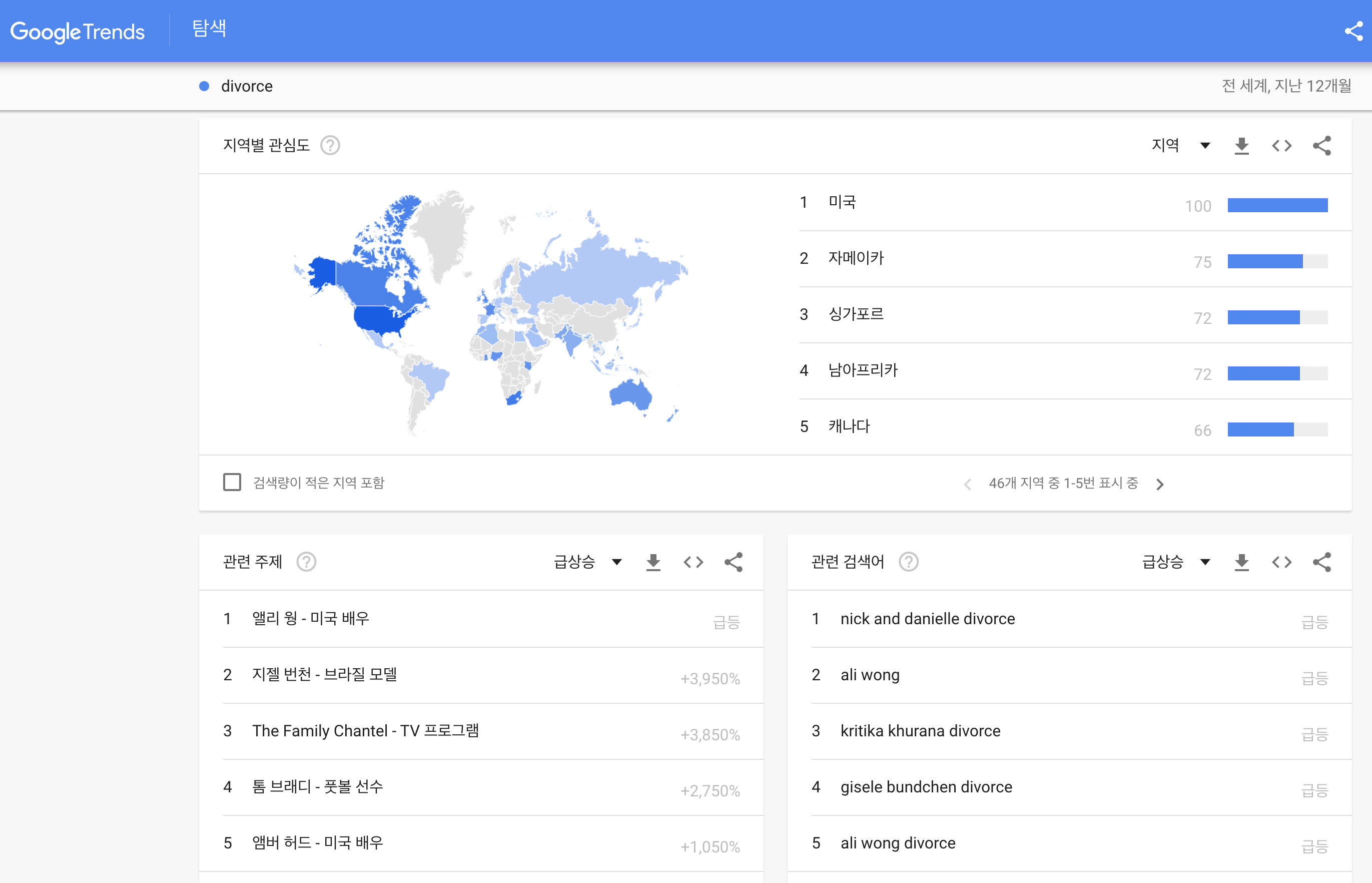 'Divorce' 로 구글 트렌드 검색을 수행한다. 2023년 2월 현재 최근 12개월의 이 검색어 상위에는 앨리웡과 최근에 이혼한 스타들이 주를 이룬다. 코미디언 앨리웡이 1위, 이후 순위는 모델 지젤 번천, TV 프로그램 The Family Chantel, 풋볼 스타 톰 브래디, 앰버 허드, 조니 뎁, 윌 스미스, 제이다 핑킷 스미스, 찰스 3세와 다이애나가 등장한다. 공통점은 모두 알려진 스타들의 이혼 사건에 관계된 검색어라는 점, 그렇기 때문에 커플이 모두 등장한다는 점이다. 지젤 번천-톰 브래디, 앰버 허드-조니 뎁, 윌-제이다 핑킷 스미스, 찰스 3세-다이애나는 모두 전현직 부부로 최근에 이혼을 했거나 이혼 소송이 진행중이거나, 결별 수순을 밟고 있다. The Family Chantel의 경우 커플 리얼리티 프로그램인 것으로 안다. 우리는 이 이혼들을 미디어를 통해서 쉽게 볼 수 있다.