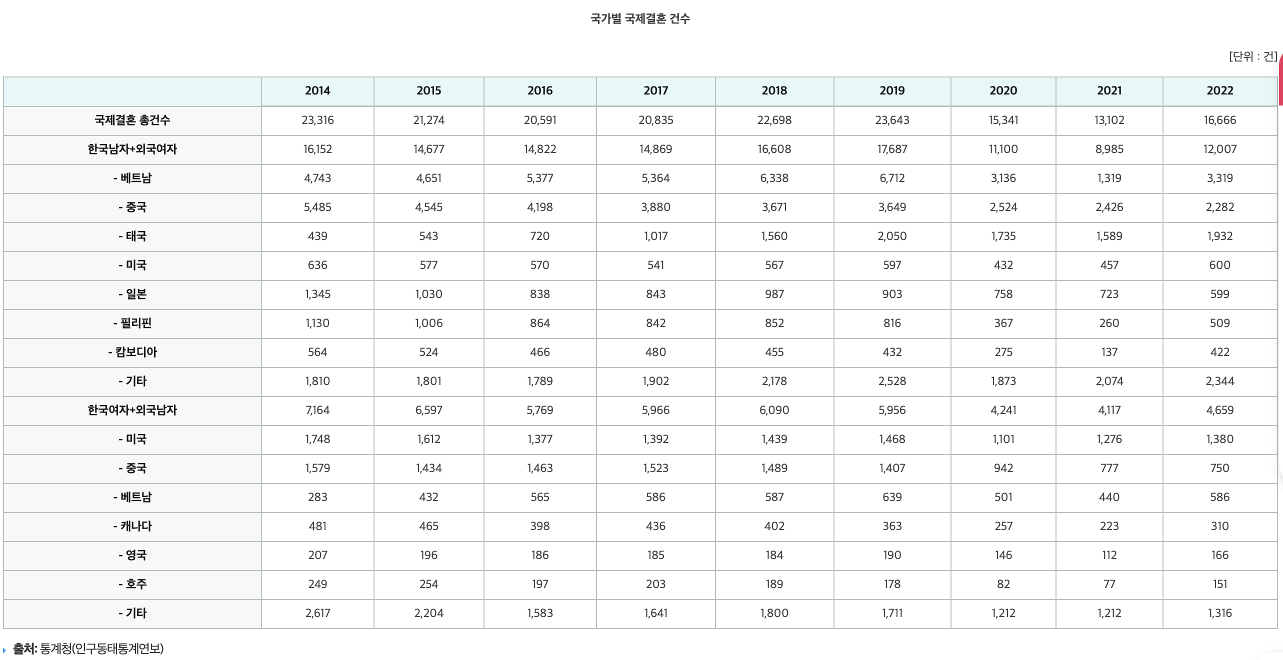 아래 통계는 index.go.kr에서 e-나라지표를 통해서 찾은 통계청 자료를 캡쳐한 것이다. 2023년에 발표된, 2022년까지 집계된 통계 수치를 2014년 부터 보여주는 테이블이다. 이 표는 '국제결혼 증가 추세?' 등의 간단한 검색어만으로 쉽게 찾을 수 있다. 굳이 캡쳐 이미지를 붙여 넣자면 다음과 같다.
