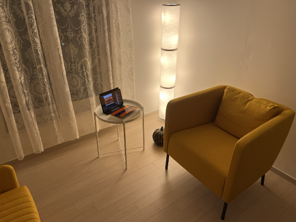 이 공간은 너희들에게 아빠가 어떤 이야기를 해주는 모습을 상상해서 만든 공간이다. 특히 우리 딸은 항상 "이야기"를 해달라고 하는데, 아빠는 그게 너무 좋단다. 색상은 노란색과 흰색, 커튼도 흰 색으로 얇게 해두었다. 집의 서북방 공간이고, 다른 가구 없이 아빠와 너희들이 앉을 수 있는 공간으로 1인 소파와 2인 소파, 그리고 가장 화려한 조명으로 꾸며져 있다.