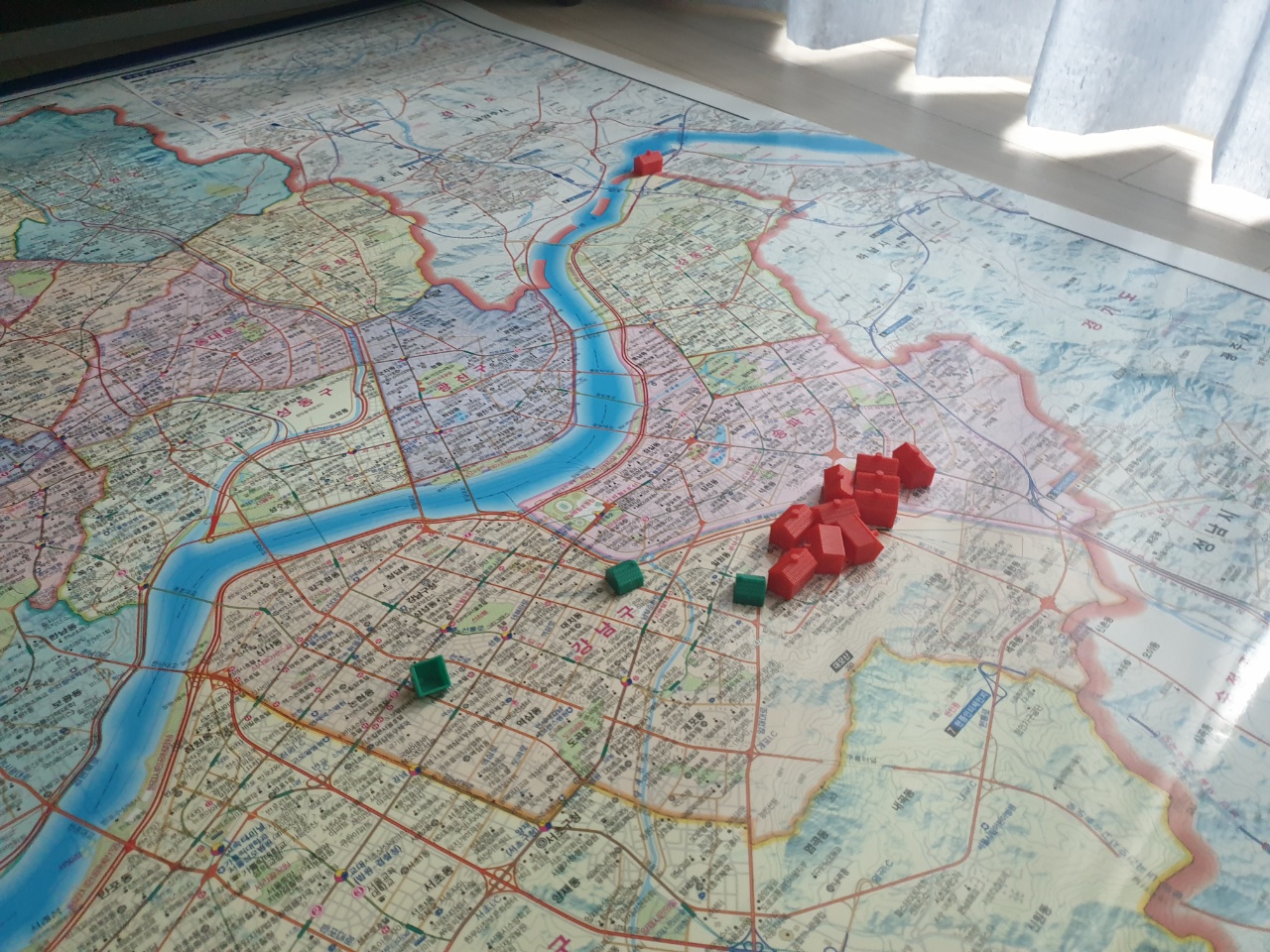 그럼에도 불구하고, 녀석은 모노폴리의 집과 호텔을 이용해서 제가 놓고 싶은 곳에 집과 호텔을 지어놓았다. 내가 가르쳐준 것이라고는 붉은색 굵은 선이 서울의 경계이고, 파란 것이 한강이라는 사실이다. 아들과 딸, 엄마와 아빠 모두 어디에 사는지 모른다. 말해주긴 했지만, 그 위치를 기억하지는 않는다.