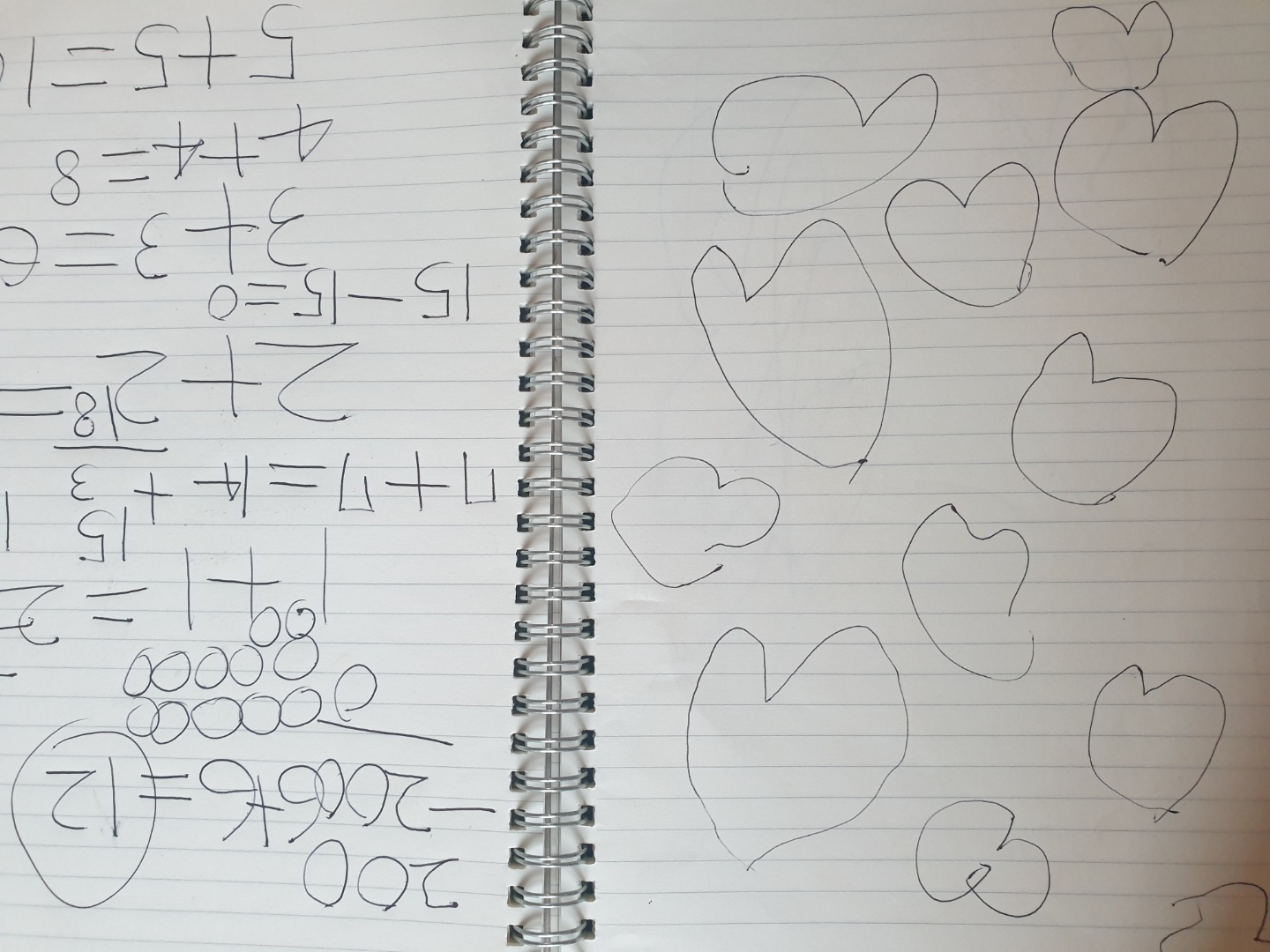 그래서 내가 다음에 애들에게 해줄 것이 정해졌다. 이제 집에는 성인용 책이 꽂힌 책장과 성인용 규격의 축구공, 줄넘기, 악기 같은 걸 집안에 들여놓는 일이다. 그리고 지금까지 해왔던 공책에 글자쓰기와 그림 그리기를 계속 하는 일이다. 이제는 아이들이 그림을 그리고 액자로 걸어올려달라고 얘기한다.